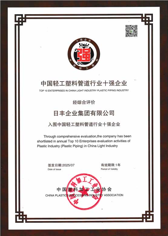 日豐企業集團有限公司是中國新型塑料管道研發生產與推廣應用的知名企業,中國給水管道升級、變革的重要推動者,是中國塑料加工工業協會塑料管道專業委員會副理事長單位,國家火炬計劃重點高新技術企業,同時也是管道與衛浴全面發展的大型建材產業集團。