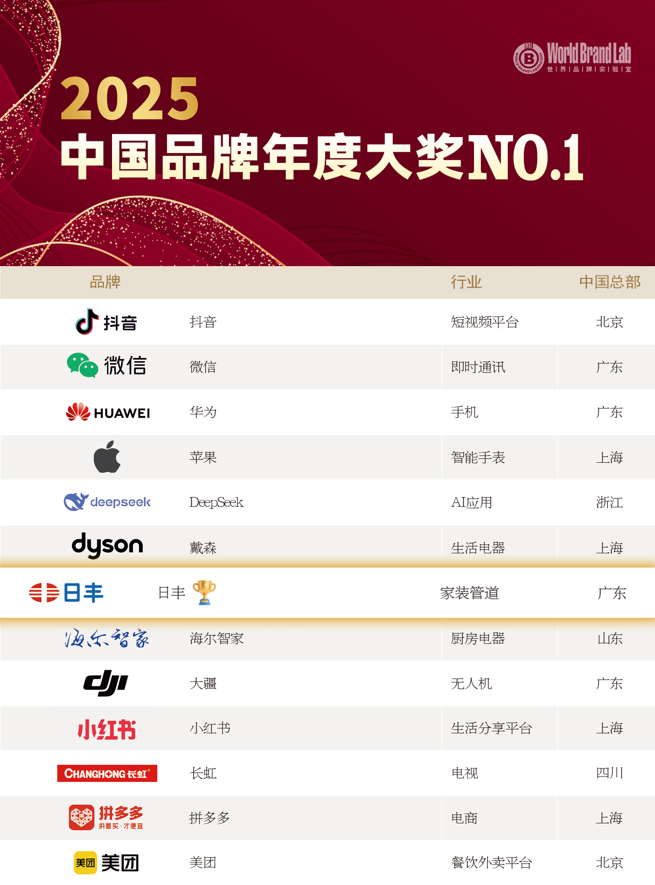 本次評選歷時半年,深入調(diào)研分析全國100多個行業(yè)/品類的3000余個知名品牌,綜合考量品牌影響力、企業(yè)年度銷售收入、主營利潤、消費者評價及行業(yè)貢獻等核心維度。日豐能夠從中脫穎而出,不僅是品牌綜合實力超越同儕的力證,更意味著日豐在滿足人民群眾高品質(zhì)居住需求,助力“好房子”建設(shè)的核心價值得到全球權(quán)威機構(gòu)的高度認可,成為家裝管道領(lǐng)域深植消費者心智、承載信任與價值的具有世界級影響力的品牌。