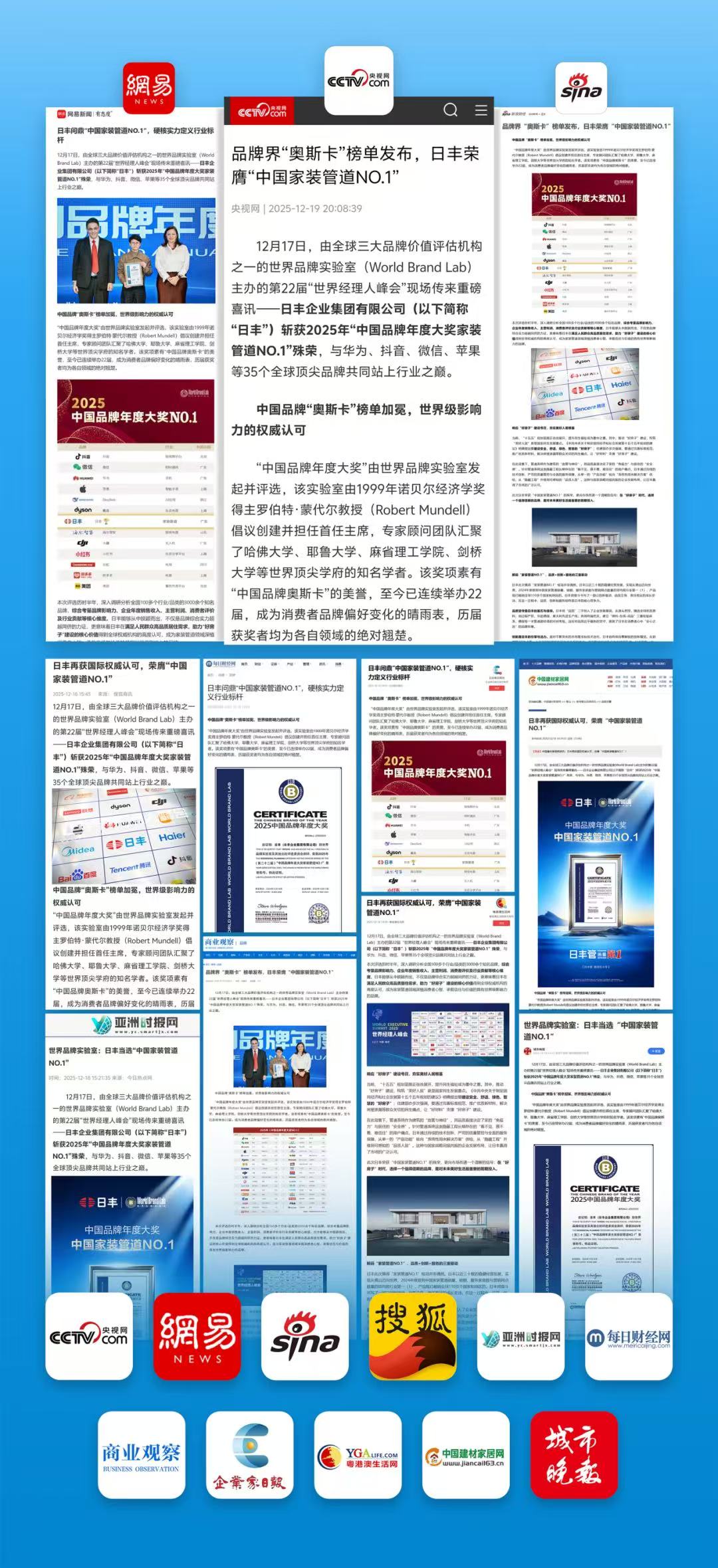 日豐榮膺“中國家裝管道NO.1”的喜訊,引發(fā)媒體廣泛關(guān)注。央視網(wǎng)、新浪、網(wǎng)易、搜狐等10余家主流媒體第一時間跟進報道,聚焦日豐品牌實力、行業(yè)引領(lǐng)價值與民生貢獻,全方位傳遞對日豐的高度認可與肯定。在“好房子”建設(shè)成為國家民生重點的背景下,日豐憑借對品質(zhì)的敬畏與對用戶的真誠,不僅解決了隱蔽工程長期存在的消費痛點,更以可感知的品質(zhì)與服務(wù),奠定了消費者信任的基石,是“一步一個腳印”踏實走出來的行業(yè)標桿。
